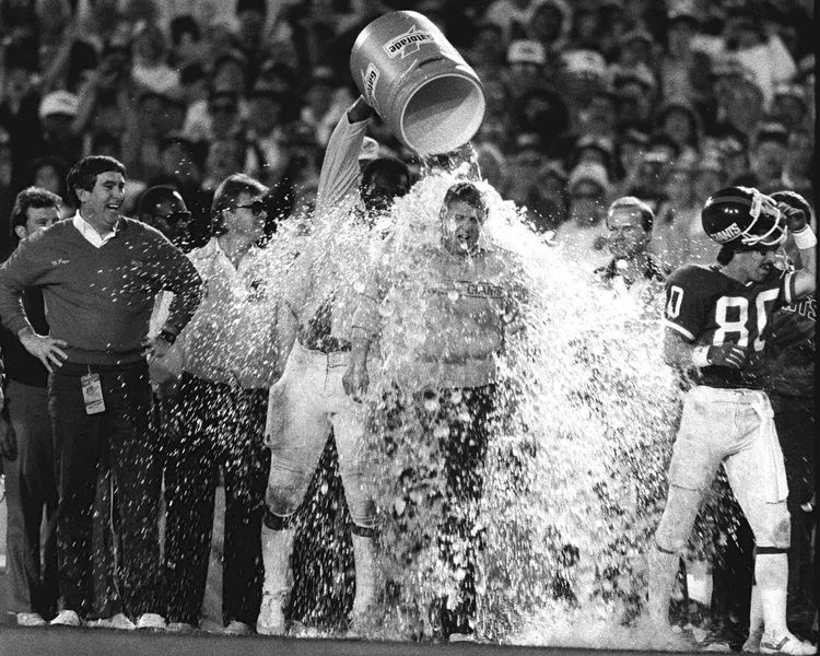 So he revived the Gatorade bath and continued it through the 1986 season. By the time the Giants had won the Super Bowl, TV’s most visible football commentator, John Madden, had begun to draw diagrams of the Gatorade stunt as if it were a key third-down play. At one point, Carson borrowed a security guard’s overcoat to allow him to sneak up on Parcells with the bucket—as if, by then, Parcells didn’t know what was coming.