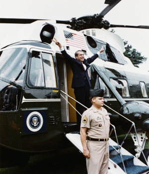 And the next day, passing through the lobby of the Mayflower Hotel, I watched televisions beam pictures of Nixon boarding his helicopter out of town. With arms thrust defiantly skyward, he flashed his incongruous “V” sign with both hands.